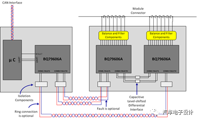 電池的AFE檢測(cè)芯片,以德州儀器 (TI) BQ79606A-Q1為例,主要的設(shè)計(jì)方向是在芯片層面提高芯片的功能安全等級(jí)和可靠性。高度集成的BQ79606A-Q1 可精確監(jiān)控溫度和電壓水平,有助于最大限度地延長(zhǎng)電池使用壽命和上路時(shí)間。此外,BQ79606A-Q1電池監(jiān)控器具有安全狀態(tài)通信功能,可幫助系統(tǒng)設(shè)計(jì)人員滿足汽車安全完整性等級(jí)D(ASIL-D)的要求。這是ISO 26262道路車輛標(biāo)準(zhǔn)定義的最高功能安全目標(biāo)。 目前AFE方面,在電壓檢測(cè),溫度檢測(cè)和通訊功能達(dá)到汽車安全完整性等級(jí)ASIL-D。 在通信方面,AFE占據(jù)主要的功能,從之前的CAN大部分企業(yè)都逐步過(guò)渡到的菊花鏈的通信方式,在菊花鏈的環(huán)體系結(jié)構(gòu),即使在一端通訊電纜斷開的情況下,也可以通過(guò)反向通訊保證所有電池模組的通訊在設(shè)計(jì)方面中,無(wú)需外部齊納二極管也可實(shí)現(xiàn)強(qiáng)大的熱插拔性能。目前電池系統(tǒng)需要優(yōu)化低溫下的充電/放電性能,并確保高溫下電池保持在安全的工作區(qū)域內(nèi)。為了應(yīng)用適當(dāng)?shù)臒峁芾聿呗?,有必要在電?電池組水平上進(jìn)行準(zhǔn)確的電壓和溫度感測(cè)(BQ79606A-Q1)。這些可能需要在冷啟動(dòng)條件下進(jìn)行預(yù)熱,并在較高溫度下進(jìn)行冷卻。